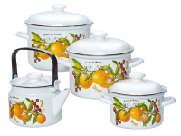 Набор эмалированной посуды "Фруктовая фантазия" состоит из трех кастрюль разного объема (3 л, 4,5л и 6 л) с крышками и чайника (объем 2 л). Изделия изготовлены из высококачественной стали с эмалированным покрытием. Покрытие устойчиво к механическому воздействию, не царапается и не "сходит", а стальная основа практически не подвержена механической деформации, благодаря чему срок эксплуатации увеличивается. Борта корпуса и крышки изделий защищены ободком из коррозионностойкой стали.