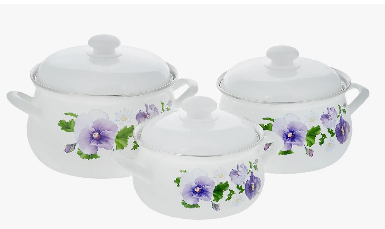 Набор посуды "Анютины глазки" состоит из трех кастрюль разного объема с крышками. Изделия изготовлены из стали высокого качества с эмалированным покрытием.