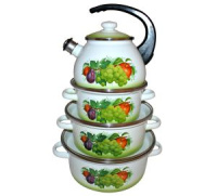 Набор эмалированной посуды "Фреш" состоит из трех кастрюль конической формы разного объема (2 л,3 л и 4 л) с крышками и чайника (объем 2,5 л). Изделия изготовлены из высококачественной стали с эмалированным покрытием. Покрытие устойчиво к механическому воздействию, не царапается и не "сходит", а стальная основа практически не подвержена механической деформации, благодаря чему срок эксплуатации увеличивается. Борта корпуса и крышки изделий защищены ободком из коррозионностойкой стали. Чайник оснащен удобной консольной пластиковой ручкой и стальной крышкой. Носик чайника с насадкой-свистком позволит вам контролировать процесс подогрева или кипячения воды.