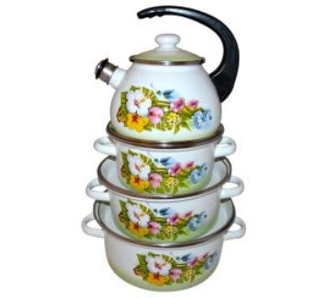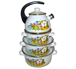 Набор эмалированной посуды "Колибри" состоит из трех кастрюль конической формы разного объема (2 л,3 л и 4 л) с крышками и чайника (объем 2,5 л). Изделия изготовлены из высококачественной стали с эмалированным покрытием. Покрытие устойчиво к механическому воздействию, не царапается и не "сходит", а стальная основа практически не подвержена механической деформации, благодаря чему срок эксплуатации увеличивается. Борта корпуса и крышки изделий защищены ободком из коррозионностойкой стали. Чайник оснащен удобной консольной пластиковой ручкой и стальной крышкой. Носик чайника с насадкой-свистком позволит вам контролировать процесс подогрева или кипячения воды.