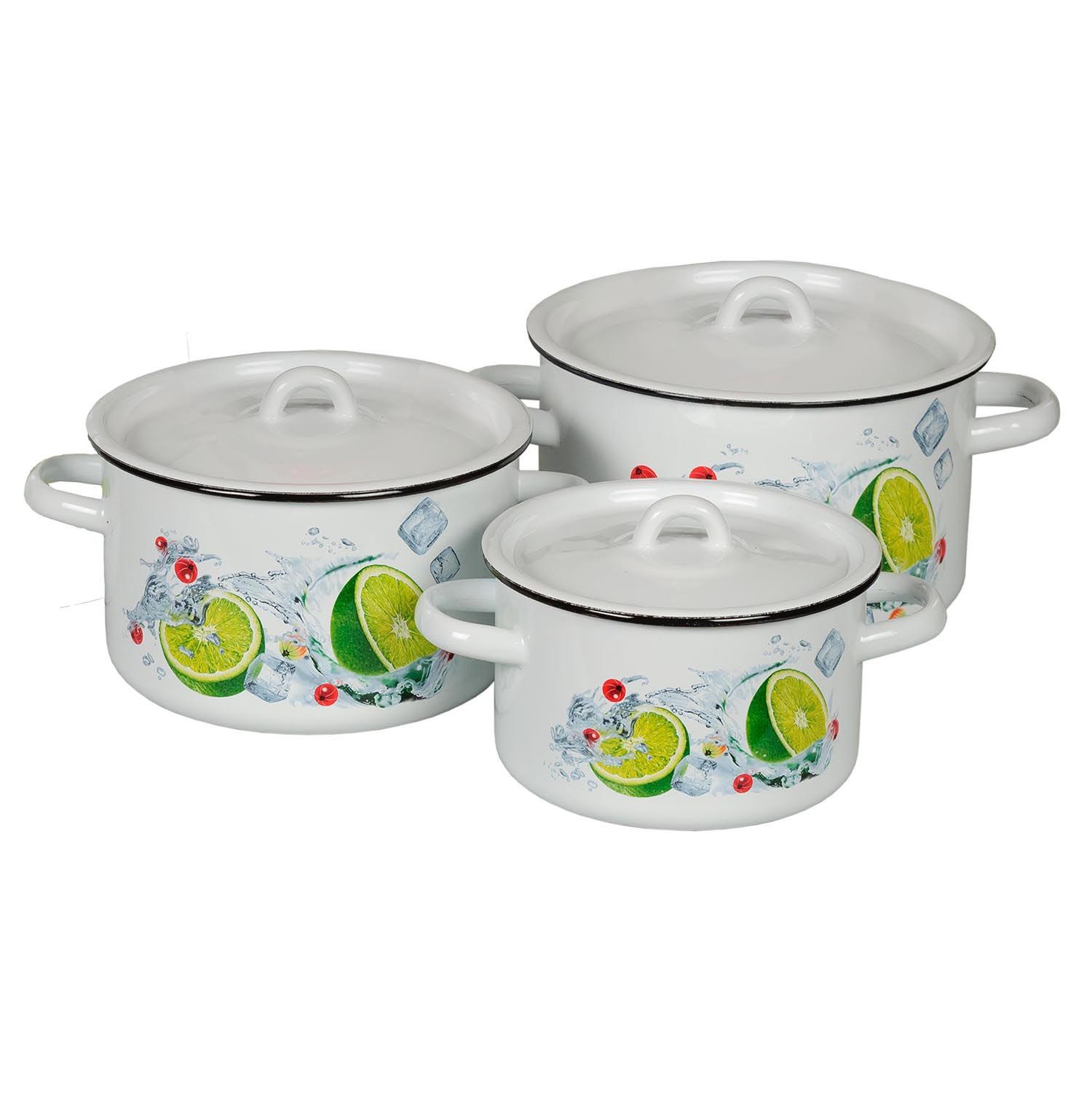 Набор эмалированной посуды производства СтальЭмаль "Мохито" состоит из 3 кастрюль разного объема (1,5 л, 2,9 л,4,5 л).