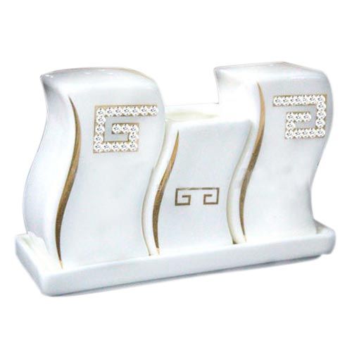 Набор для специй, изготовленный из фарфора, состоит из солонки, перечницы, емкости для зубочисток и подставки.