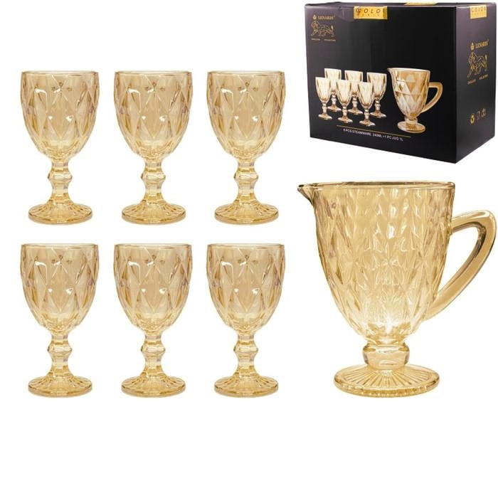 Набор из 7 предметов графин и 6 стаканов из цветного золотистого стекла.