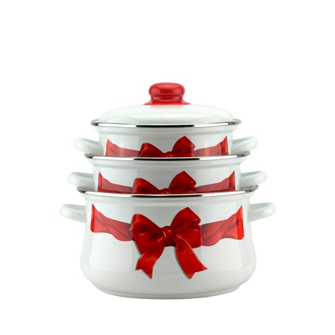 Кастрюли изготовлены из стали и покрыты эмалью, наружные стенки декорированы красным бантом. Эмалевое покрытие имеет существенные преимущества по показателям безопасности влияния на организм человека, санитарным свойствам, простоте ухода и рассчитан на длительный срок эксплуатации. Оно устойчиво к перепадам температуры до 220°С, обладает высокой механической прочностью, противостоит воздействию пищевых кислот.