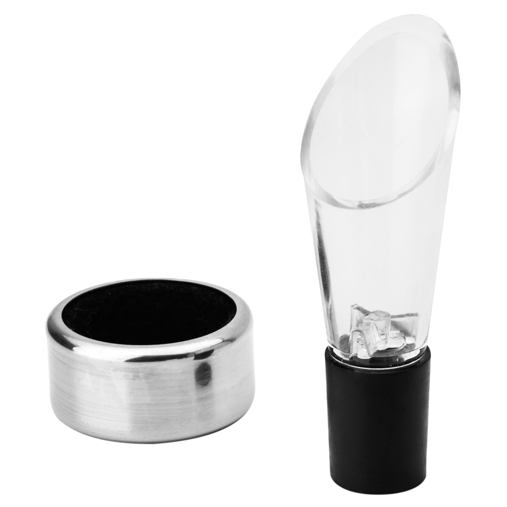 Аэратор насыщает вино кислородом, обогащая и придавая новый вкус. Кольцо с фланелевой подкладкой впитывает капли вина предотвращая пятна на поверхности.Набор аэратор и кольцо в подарочной упаковке станет отличной идеей для подарка.