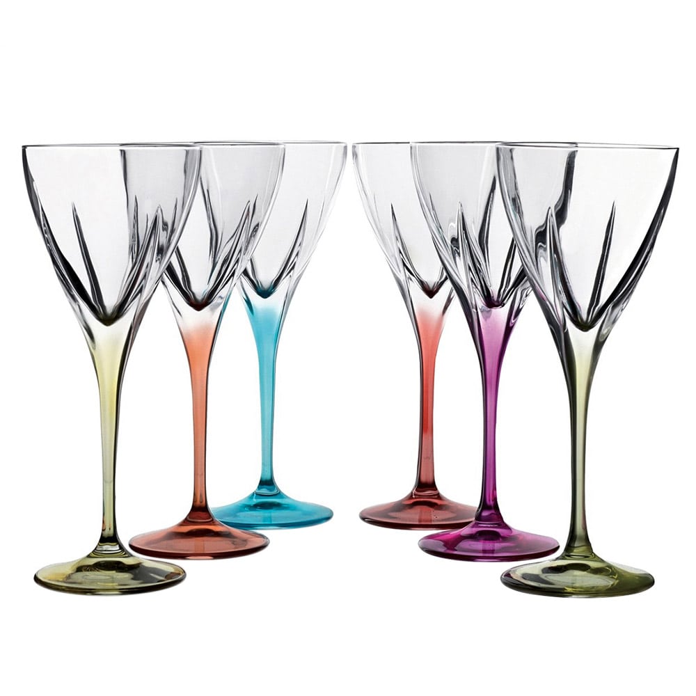 Набор из шести предметов представляет собой необычное сочетание единого дизайна и разных цветов оформления. У набора также есть и практичная функция – гости никогда не перепутают свой бокал с чужим, легко запомнив его цвет. Изделия выполнены из хрустального стекла, которое не содержит свинец и другие токсичные вещества.