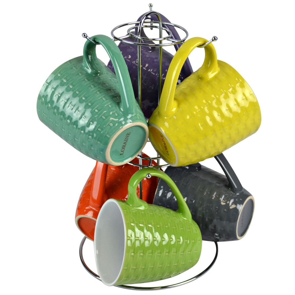 Цвета: желтый, оранжевый, зеленый, голубой, фиолетовый, черный. За счет рельефной текстуры стенок, кружки приятно держать в руках. Элегантный дизайн набора придется по вкусу и ценителям классики, и тем, кто предпочитает утонченность и изысканность. Он настроит на позитивный лад и подарит хорошее настроение с самого утра. Кружки можно мыть в посудомоечной машине и использовать в микроволновой печи.