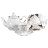 Чайный набор Грация "Насса" из фарфора с белым рельефным рисуноком и золотым декором, прямоугольная подарочная упаковка с окном и бантом. Рассчитан на 6 персон.