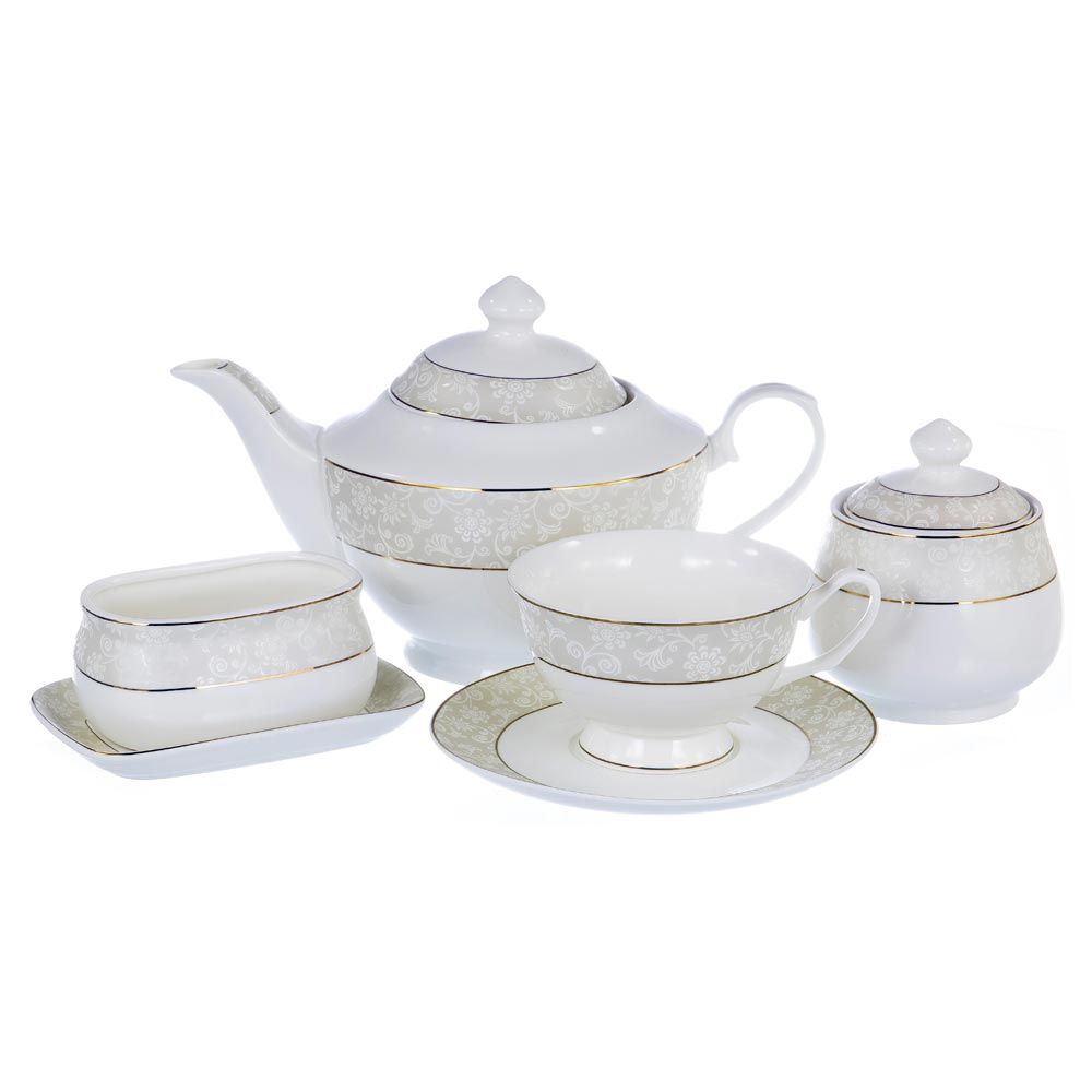 Набор чайный МАРКИЗА (16) 6 чашек 250мл + 6 блюдец + чайник + сахарница + подставка п/чайные пакетики + блюдо д/лимона, NEW BONE CHINA, цветочный дизайн с золотом, подарочная упаковка