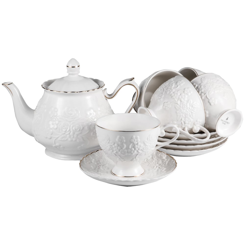 Чайный набор Грация с белым рельефным рисуноком и золотой каемкой. Продается в прямоугольной подарочной упаковке с окном и бантом. Рассчитан на 6 персон.