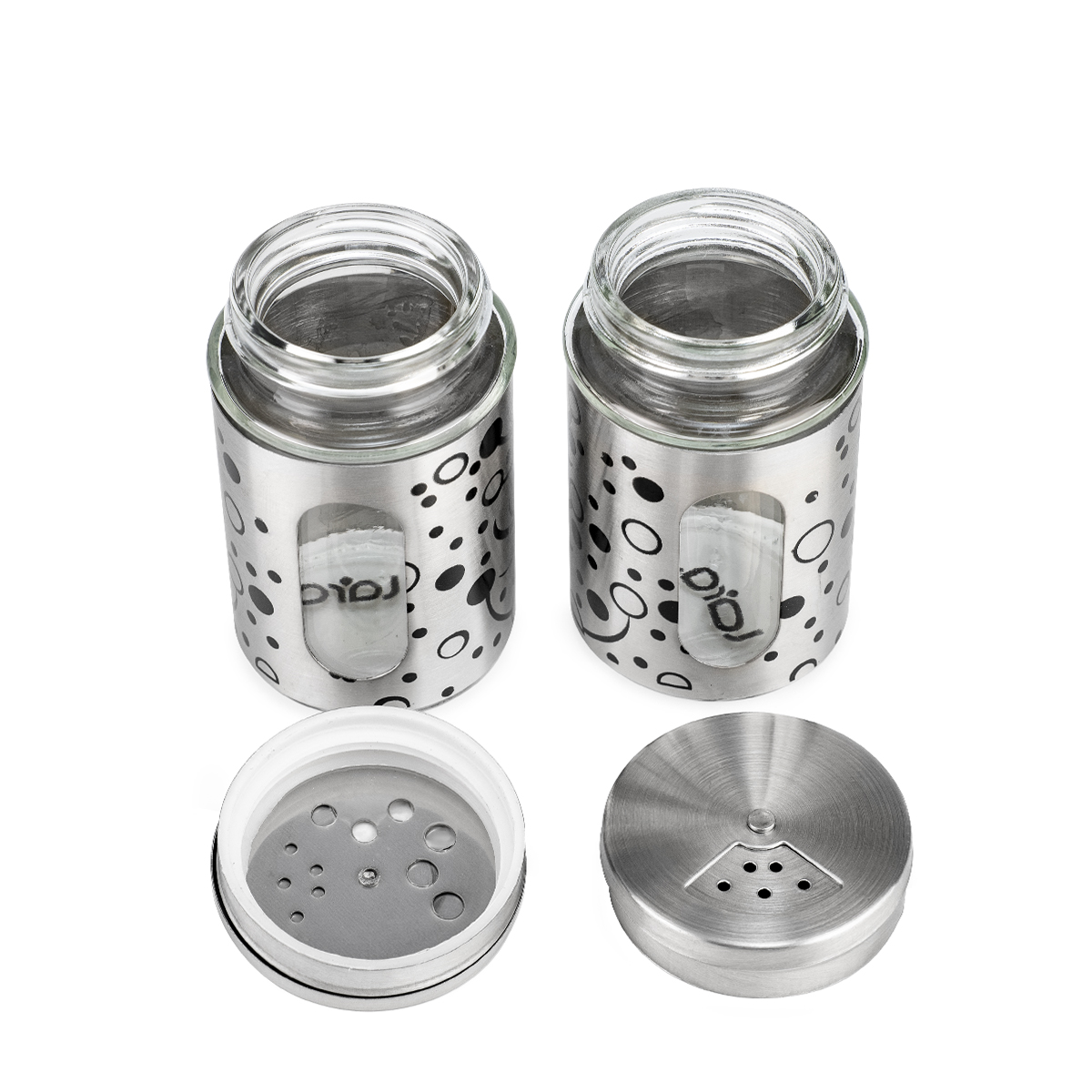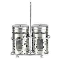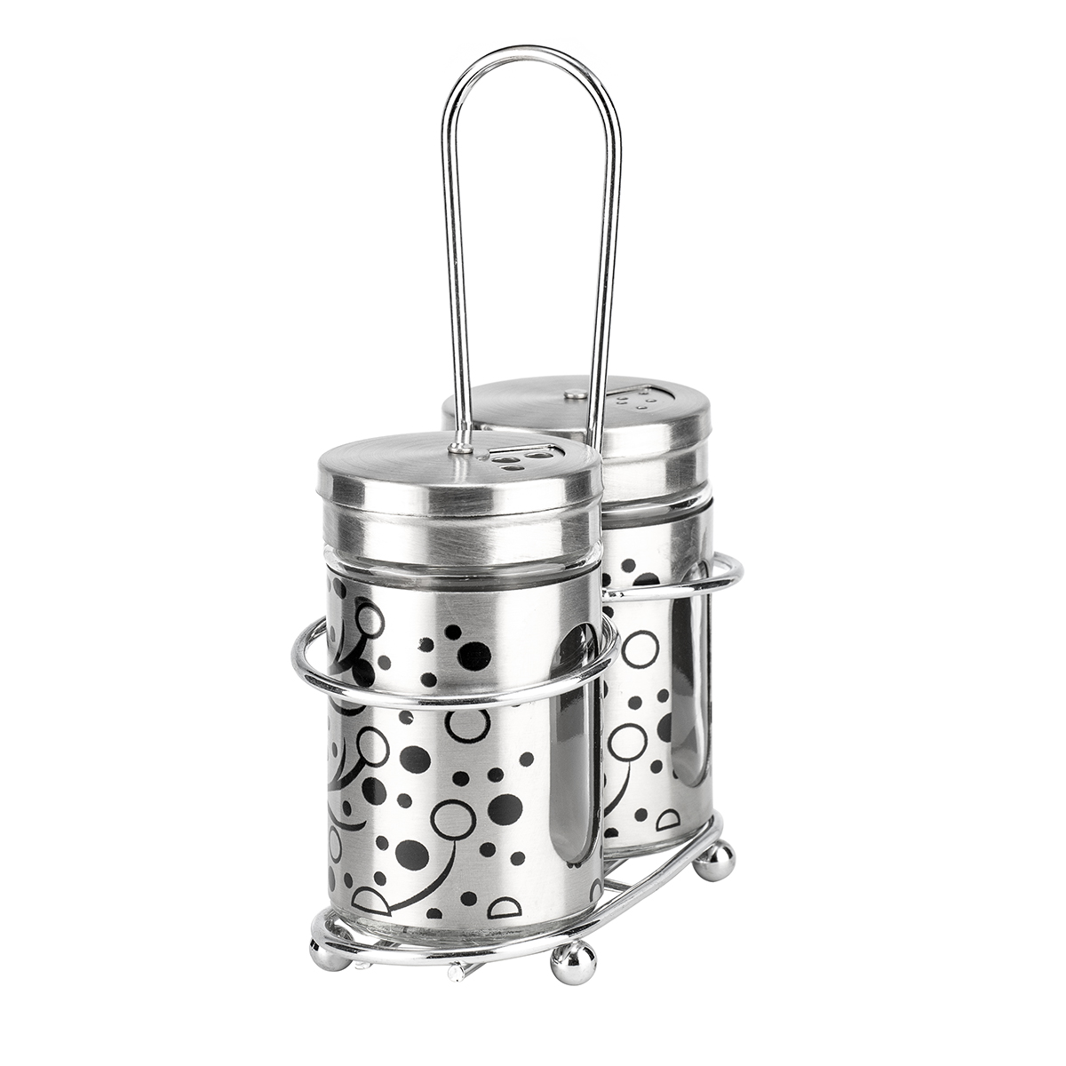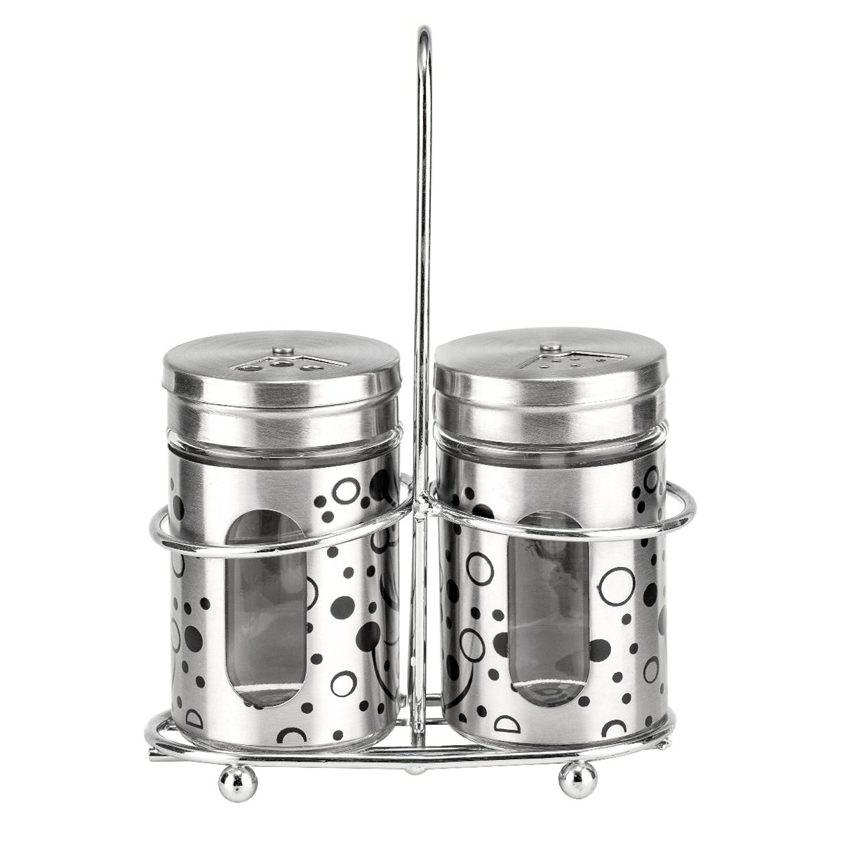 Набор для специй LARA в современном дизайне – это практичный аксессуар для ежедневной сервировки стола. В комплект входит устойчивая проволочная подставка из экологичной высококачественной нержавеющей стали с матовой полировкой. Конструкция с удобным кронштейном для переноски и двумя отделениями для хранения емкостей для специй. Солонка и перечница выполнены из прозрачного стекла. Они установлены в корпус из нержавейки с прорезями для контроля уровня наполнения. Чтобы специи не выдыхались и не отсыревали, отверстия на съемных винтовых крышках можно закрыть оборудованной створкой. Можно мыть в посудомоечной машине. Узор черного цвета на корпусе.