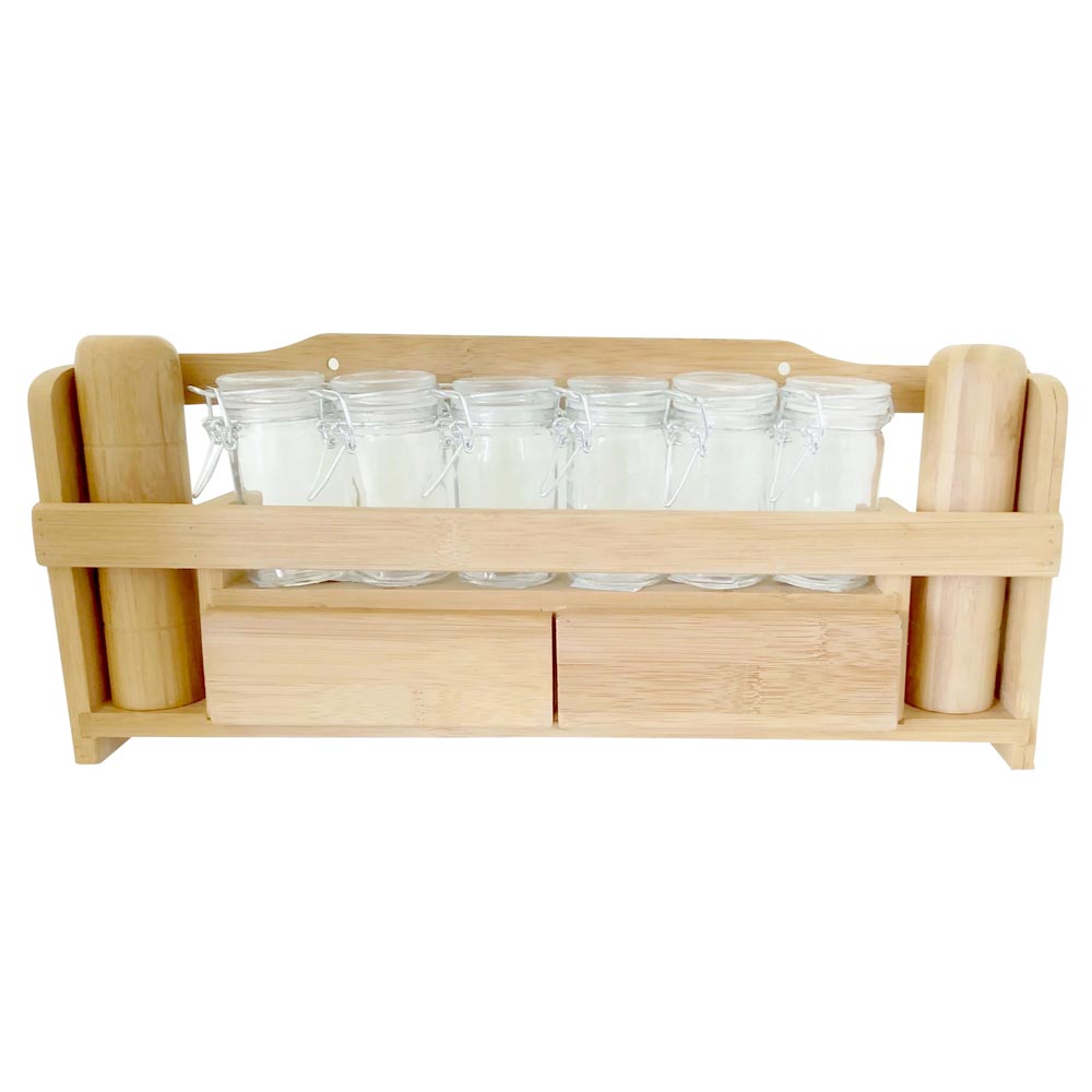 Для хранения емкостей предусмотрена бамбуковая подставка с дополнительным ящичком для хранения.