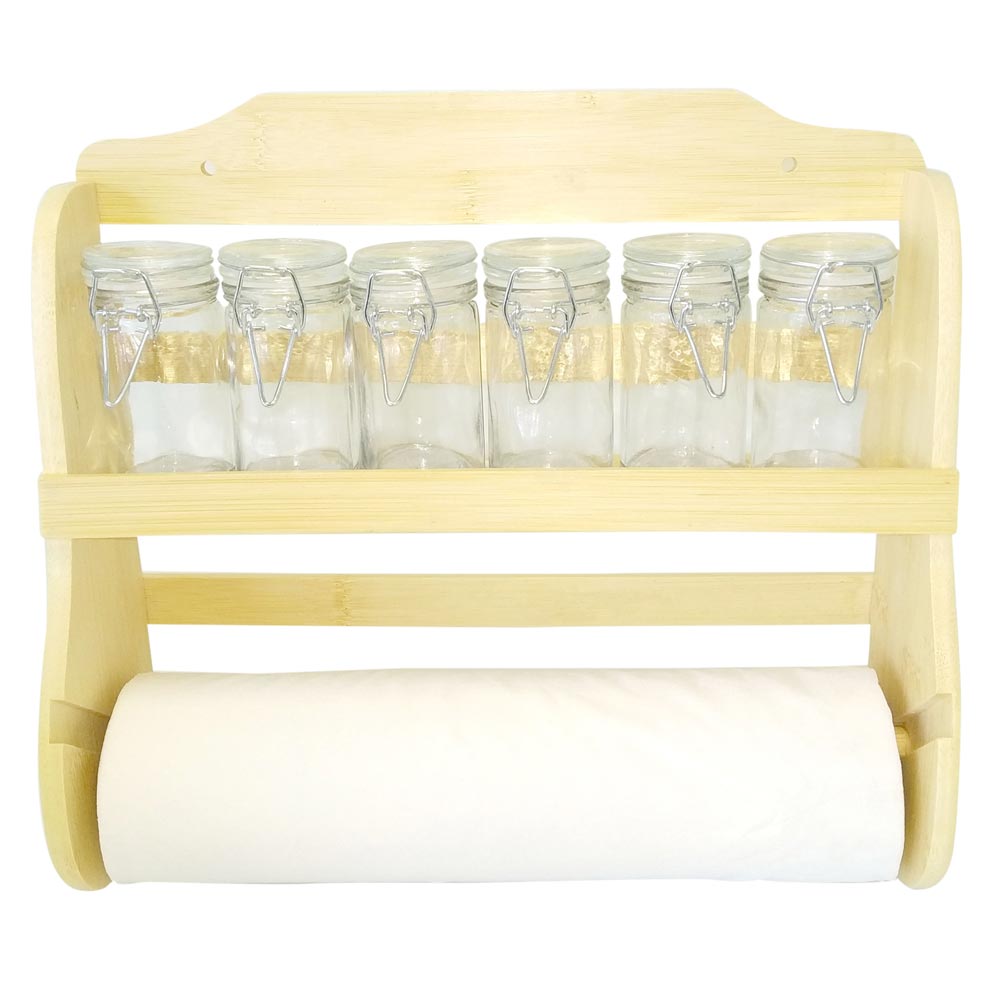 Подставка для хранения баночек выполнена из бамбука, на подставке имеется держатель для бумажных полотенец.