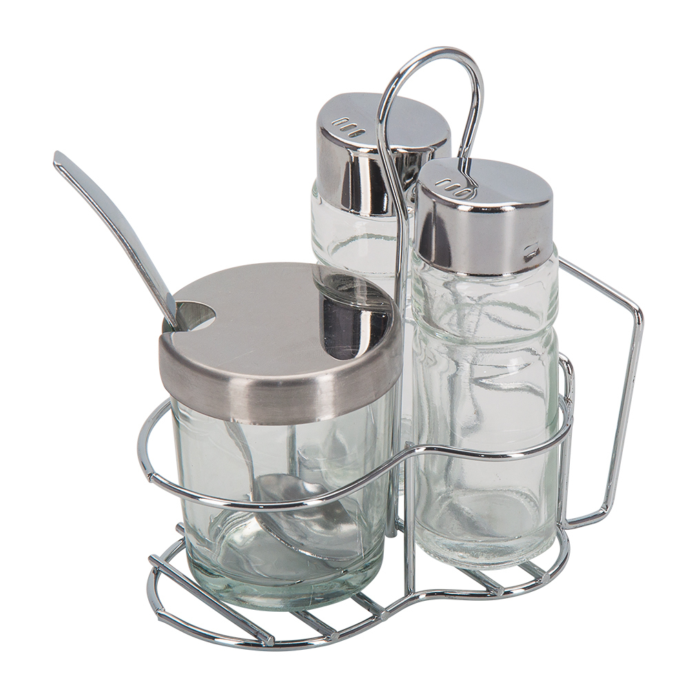 Набор для специй Aroma изготовлен из нержавеющей стали и стекла. Он состоит из железной подставки для всех компонентов набора, подставки для салфеток, перечницы, солонки и горчичницы. Стекло позволяет отслеживать в закрытом виде, когда закончится тот или иной продукт.