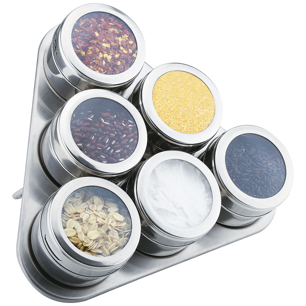 В наборе: 6 баночки с магнитным дном и с крышками со стеклянным окошком; удобная подставка из нержавеющей стали.