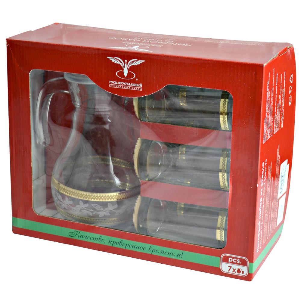 Питьевой набор "Лоза" из бесцветного натрий-кальций силикатного стекла, декорированная по наружной поверхности металлами и глянцевыми препаратами.