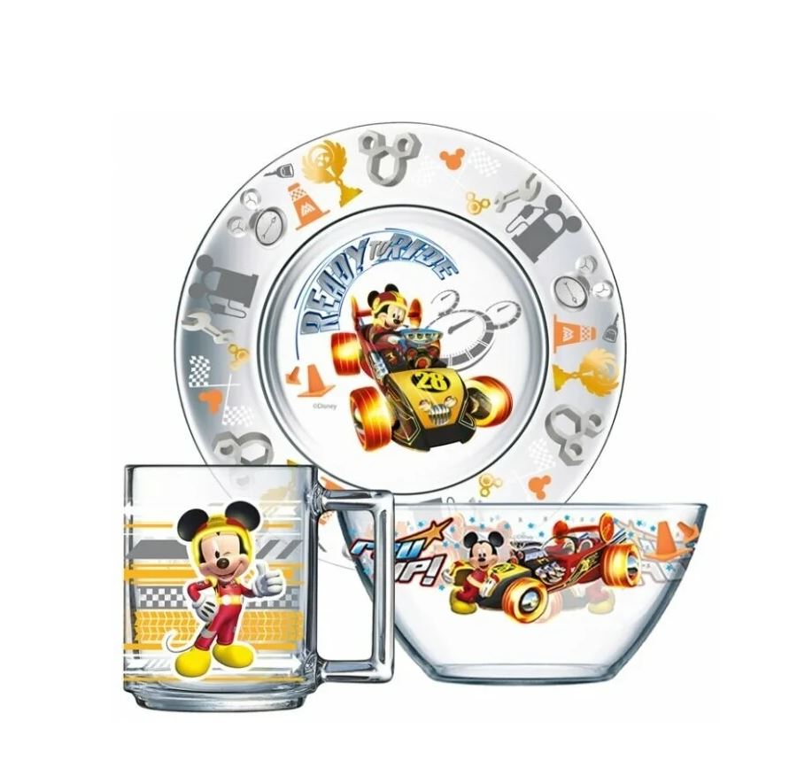 Набор для завтрака Микки гонщик изготовлен из высококачественного натрий-кальций-силикатного стекла. Такой набор определенно понравится Вашему ребенку и приём завтрака станет в разы ярче. Все предметы из данного набора можно мыть в посудомоечной машине и использовать в СВЧ.