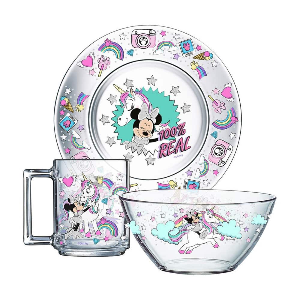 Детский набор посуды из стекла. отличается оригинальным дизайном на прозрачном стекле. Сочетание нежных цветов и забавные изображения Минни Маус со сказочным единорогом делают этот набор таким популярным среди девочек! Набор столовой посуды изготовлен из высококачественного стекла и содержит 3 необходимых предмета: тарелку (диаметр 19,5 см), салатник (объём 380 мл) и кружку (объём 230 мл).