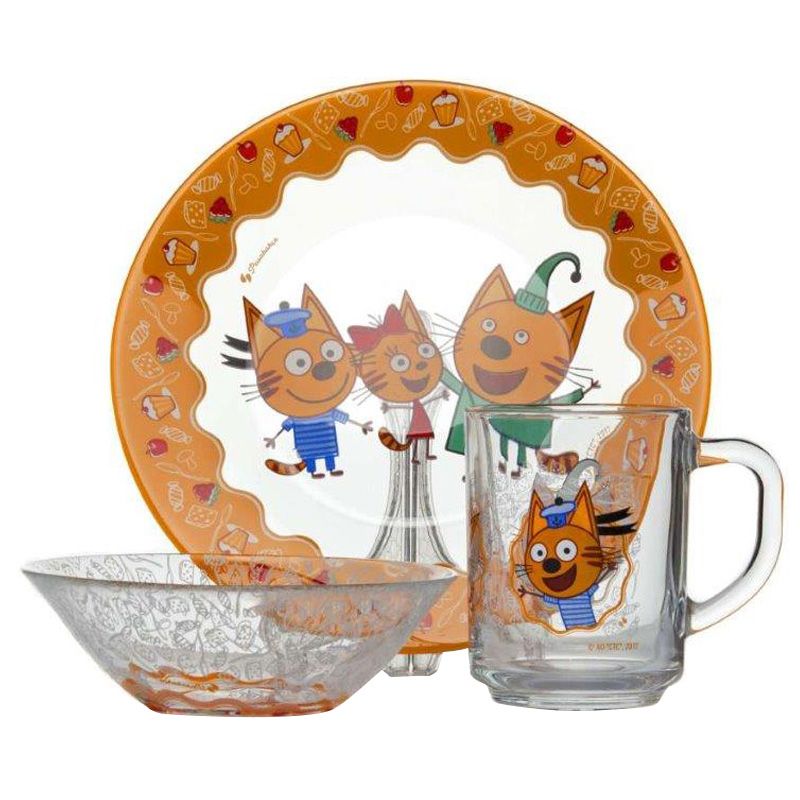 Набор детской посуды из трех предметов для пищевого использования с изображением героев развлекательного обучающего анимационного сериала "Три кота".