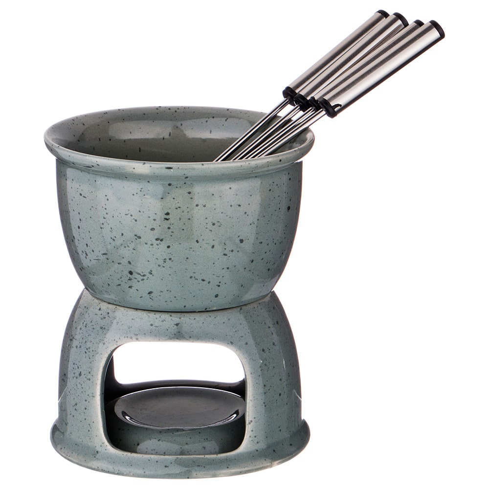 В набор входит небольшая чаша объемом 270 мл, подставка для свечи, вилочки для фондю - 4 шт.