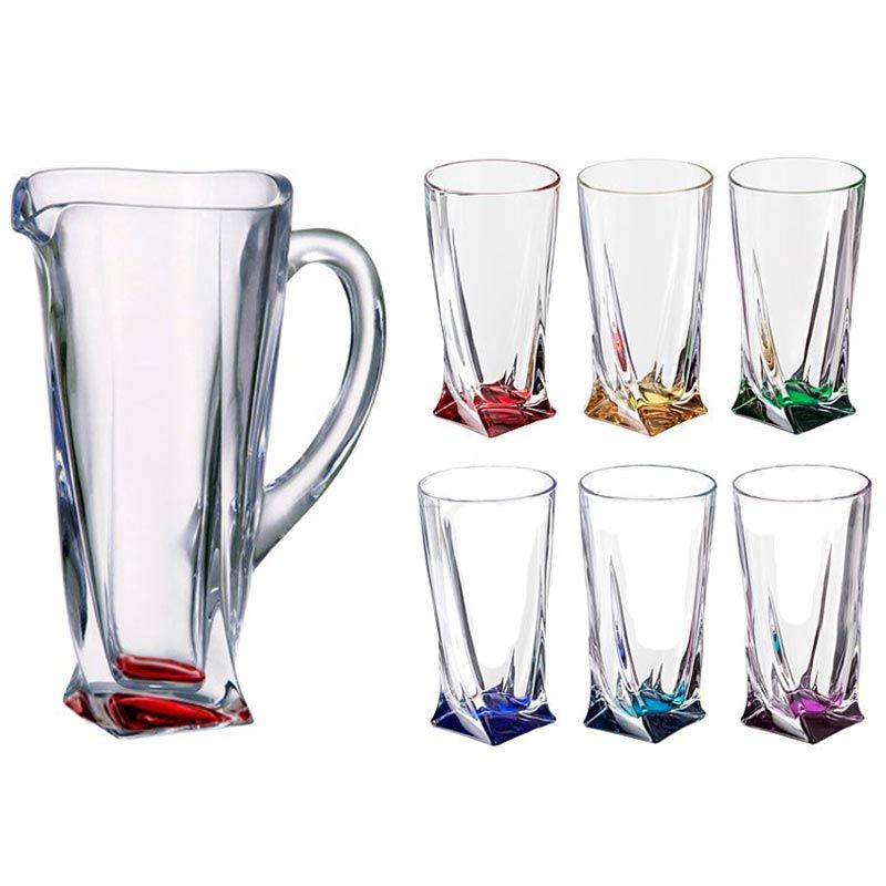 Набор "Квадро Калорс" состоит из шести стаканов и графина, выполненных из прочного утолщенного стекла "кристалайт".