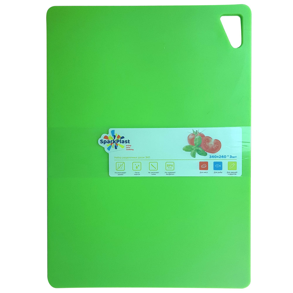 Доска SparkPlast "Eco" не гибкая, прочная, очень легкая, не затупляет ножи, при контакте с продуктами питания не наделяет их вредными токсичными веществами, не впитывает запахи.