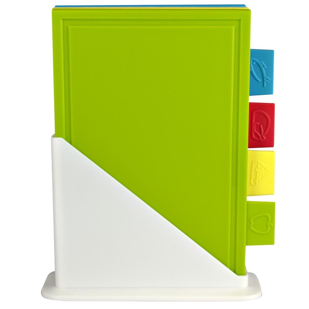 Для каждого вида продуктов мясо, рыба, овощи, сыр рекомендуется иметь отдельную разделочную доску. Giaretti предлагает удобное решение ,набор разделочных досок на подставке: цвет доски и обозначение продукта на ярлычке поможет без труда выбрать необходимую доску.