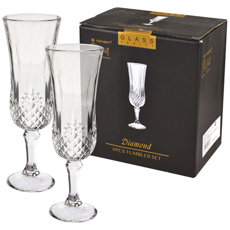 Набор фужеров Lenardi Diamond из бесцветного стекла. Предназначены для подачи игристых вин и коктейлей на их основе. В наборе 6 фужеров объемом 150 мл. Изделия можно мыть в посудомоечной машине.