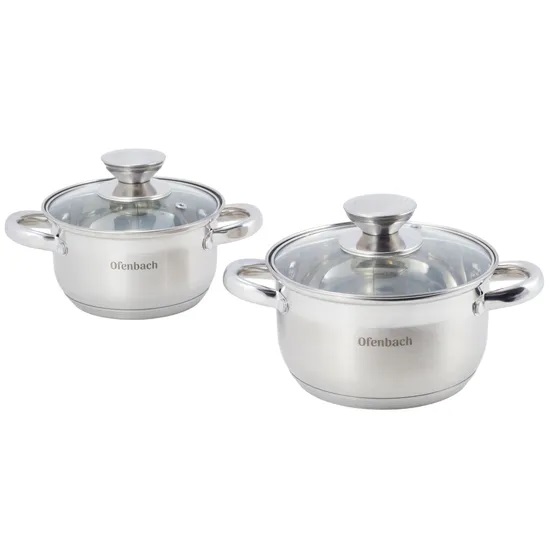 Набор кастрюль из нержавеющей стали — это идеальное решение для вашей кухни. В комплект входят четыре предмета: кастрюля объемом 1,1 л (Ø14 x 8,5 см) и кастрюля объемом 1,7 л (Ø16 x 9,5 см). Кастрюли изготовлены из высококачественной нержавеющей стали, что обеспечивает долговечность и устойчивость к коррозии, а крышки выполнены из жаропрочного стекла, позволяя контролировать процесс приготовления.