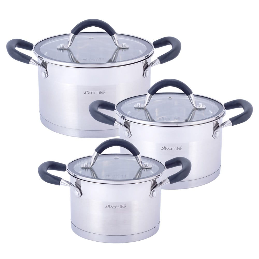 Набор Kamille KM-5752 из 3-х кастрюль с крышками. Каждая крышка из закаленного стекла. На крышке ободок из нержавеющей стали, ручка из бакелита. Кастрюли из нержавеющей стали имеют энергосберегающее дно, благодаря которому достигается максимальная теплопроводность изделия, что позволяет уменьшить время приготовления блюда. И никакой пригоревшей пищи.