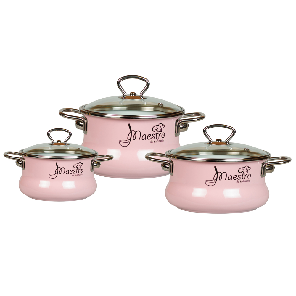 Набор кастрюль грушевидной формы Vitross "Maestro" из качественной эмалированной стали. Металлические ручки прикреплены методом клепки. В комплекте есть стеклянные крышки с пароотводом.