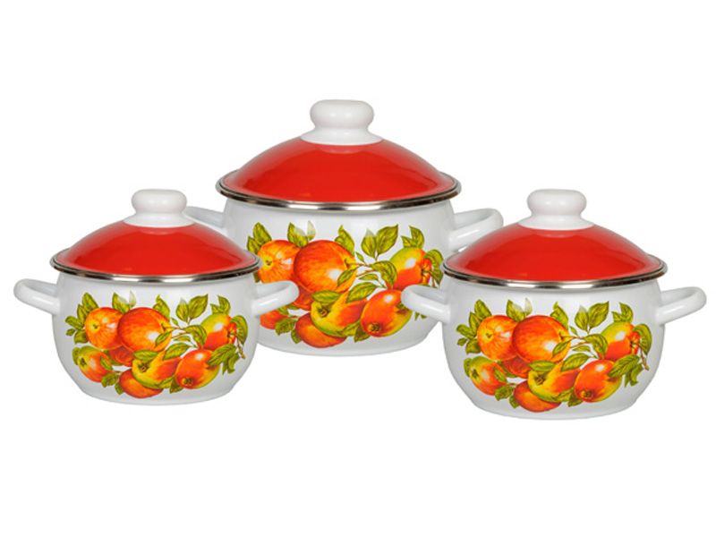 Набор эмалированных кастрюль производства "СтальЭмаль" с фруктовым рисунком "Яблочный сезон" (арт.6KH021M). Крышки оснащены эргономичными пластиковыми ручками - удобно браться, не боясь обжечься.