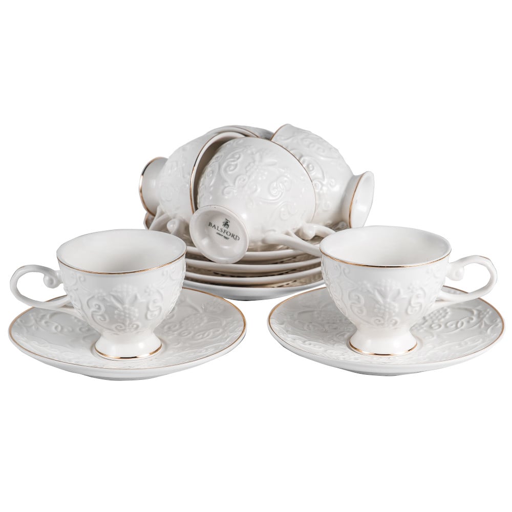 Набор кофейный Грация изготовлен из фарфора и декорирован белым рельефным рисуноком с золотом, продается в прямоугольной подарочной упаковке с окном и бантом. Идеален для подарка.