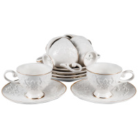 Набор кофейный Грация изготовлен из фарфора и декорирован белым рельефным рисуноком с золотом, продается в прямоугольной подарочной упаковке с окном и бантом. Идеален для подарка.