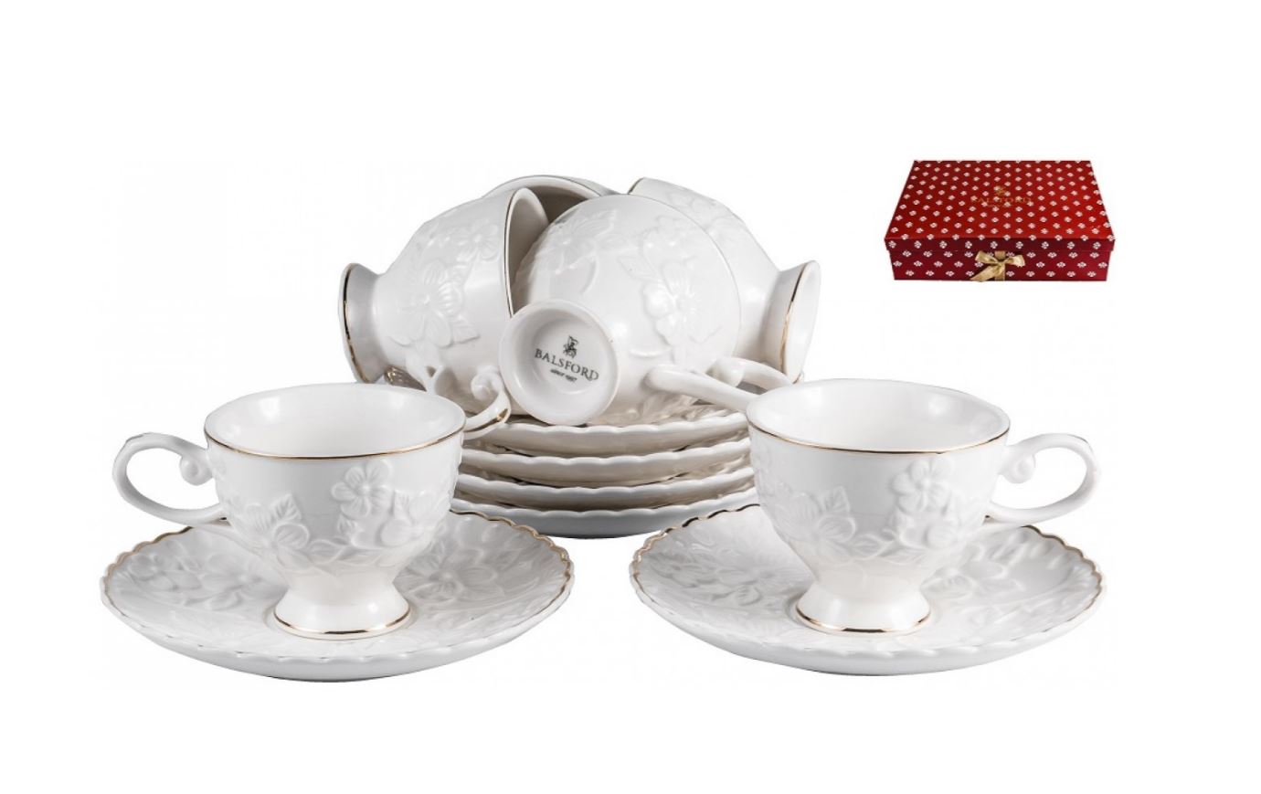 Набор кофейный "Грация" состоит из 6 чашек 100мл и 6 блюдец. Рисунок белый рельефный с золотом.