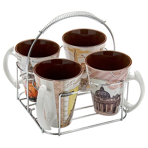 Набор из 4-х кружек изготовлен из высококачественной керамики, украшен рисунками с изображением Рима, Парижа, Москвы и Санкт-Петербурга.
