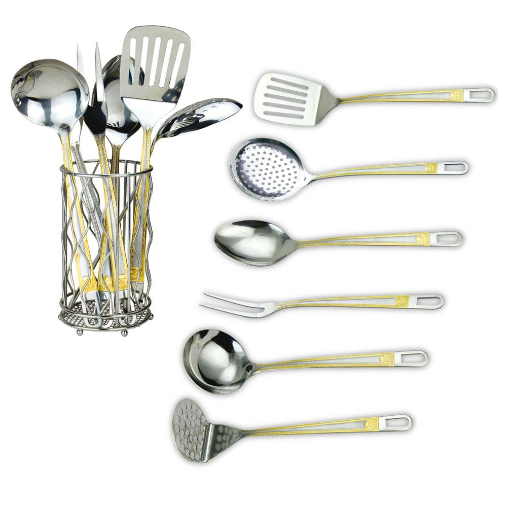Элементы под золото придают кухонным инструментам стильный внешний вид.