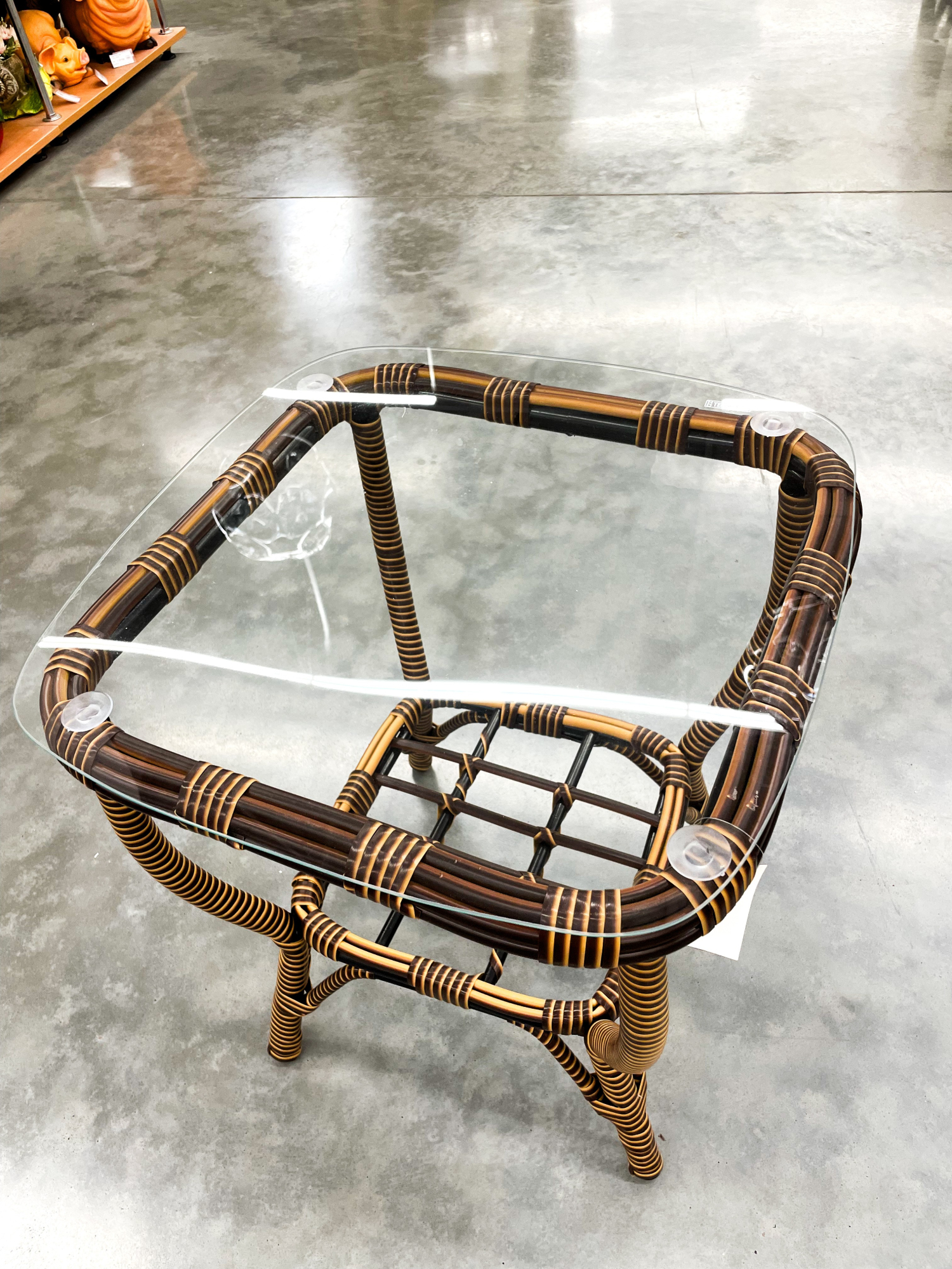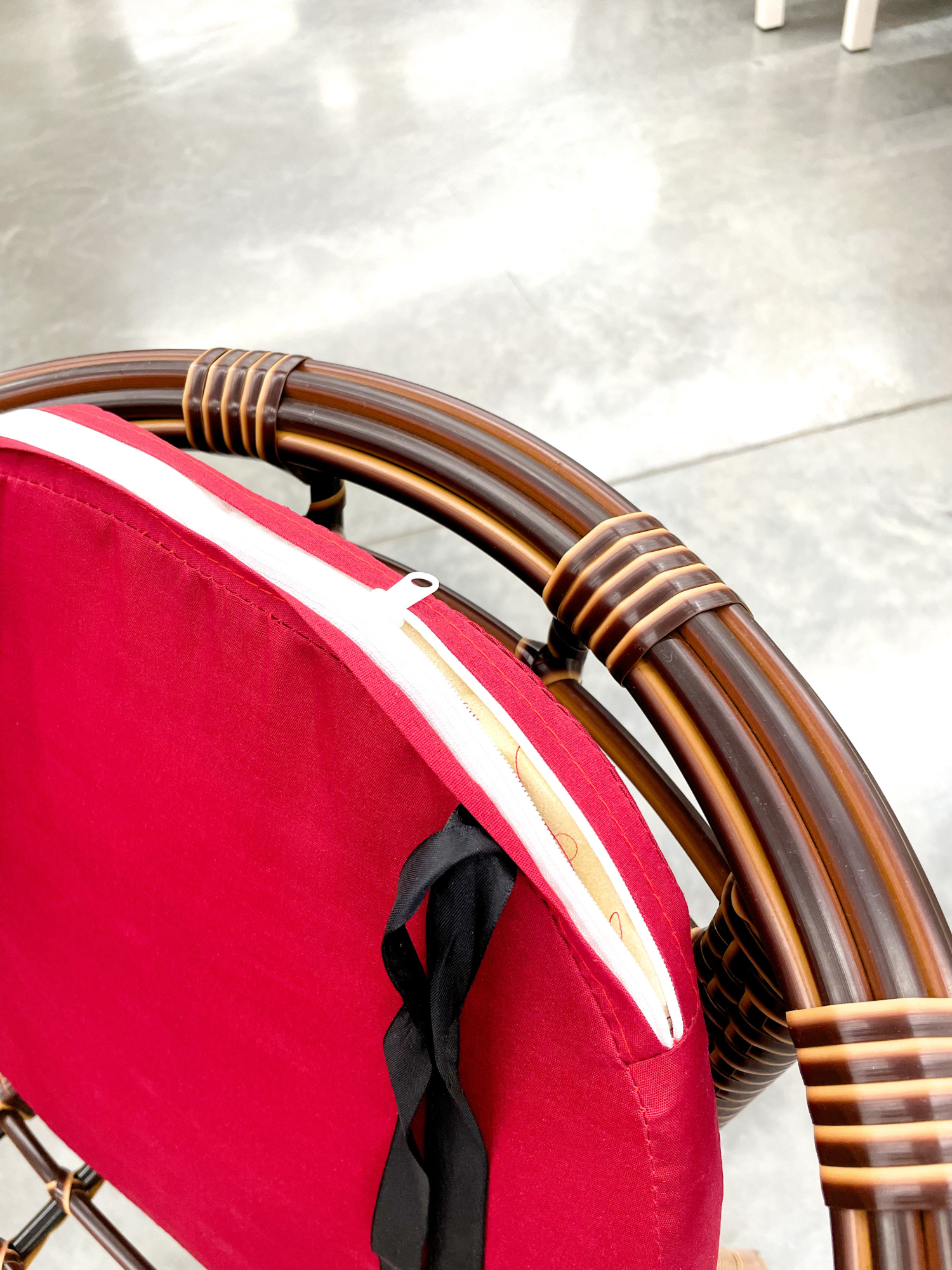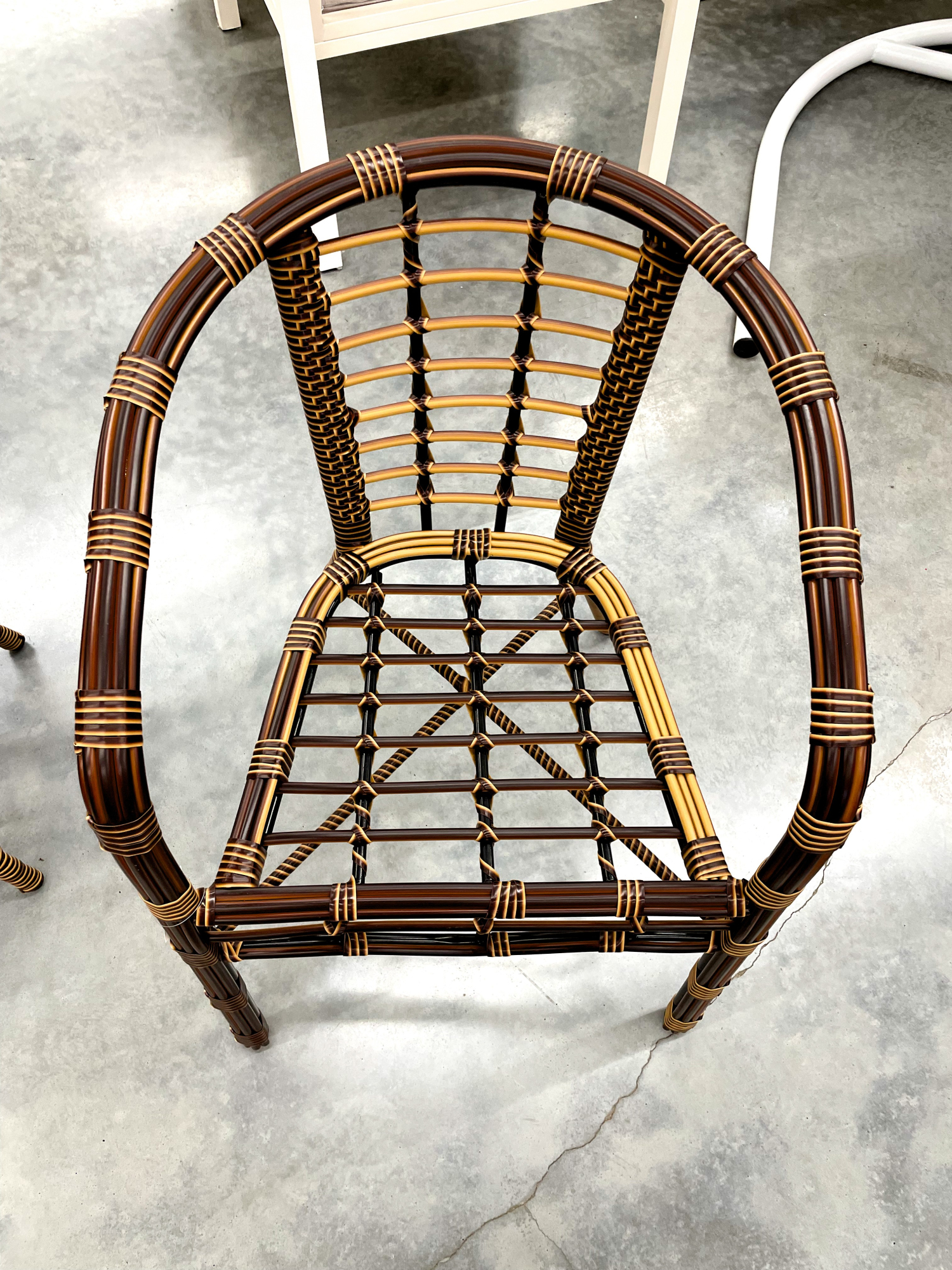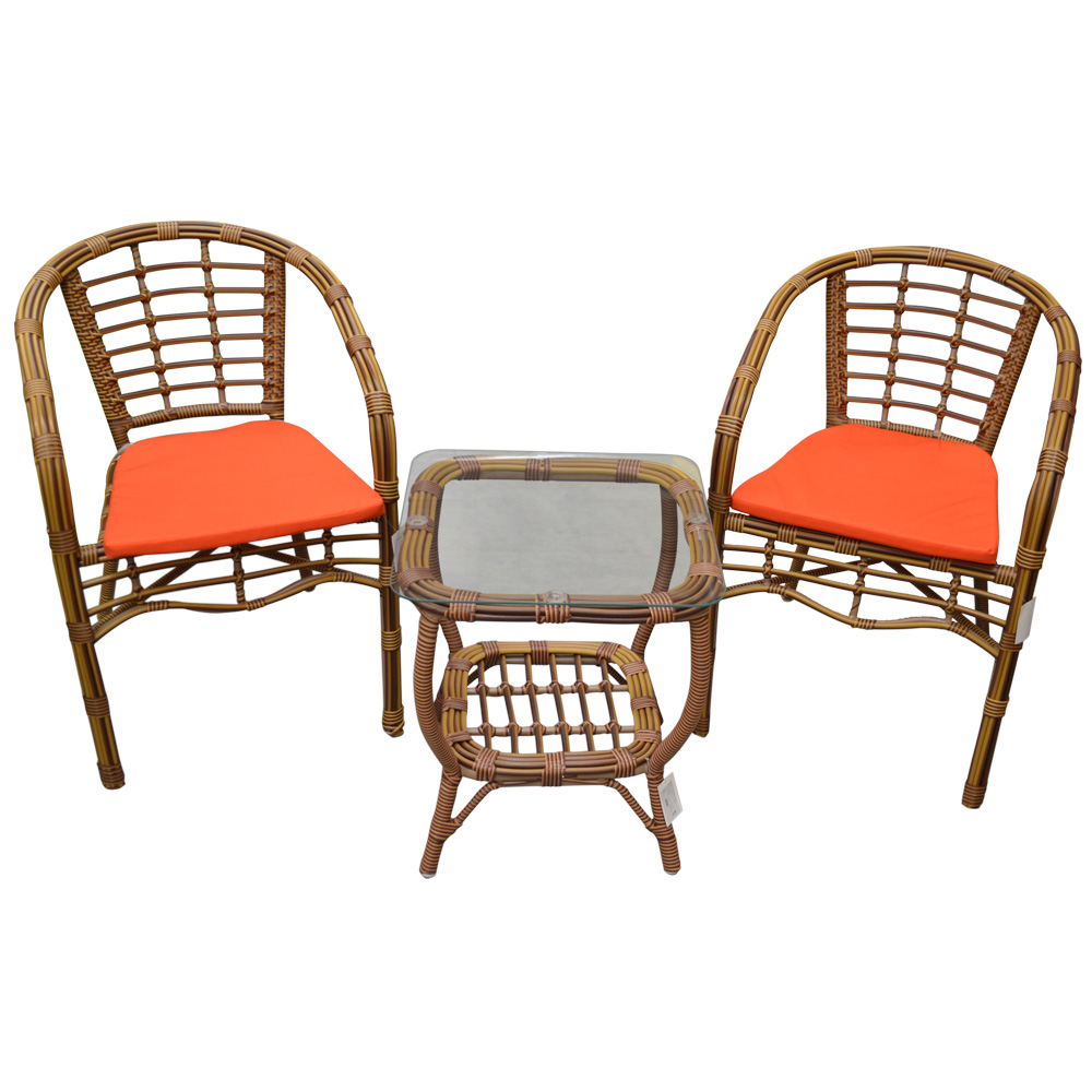 Основа каркаса алюминий, оплетка искусственным ротангом, подушки оранжевого цвета.
