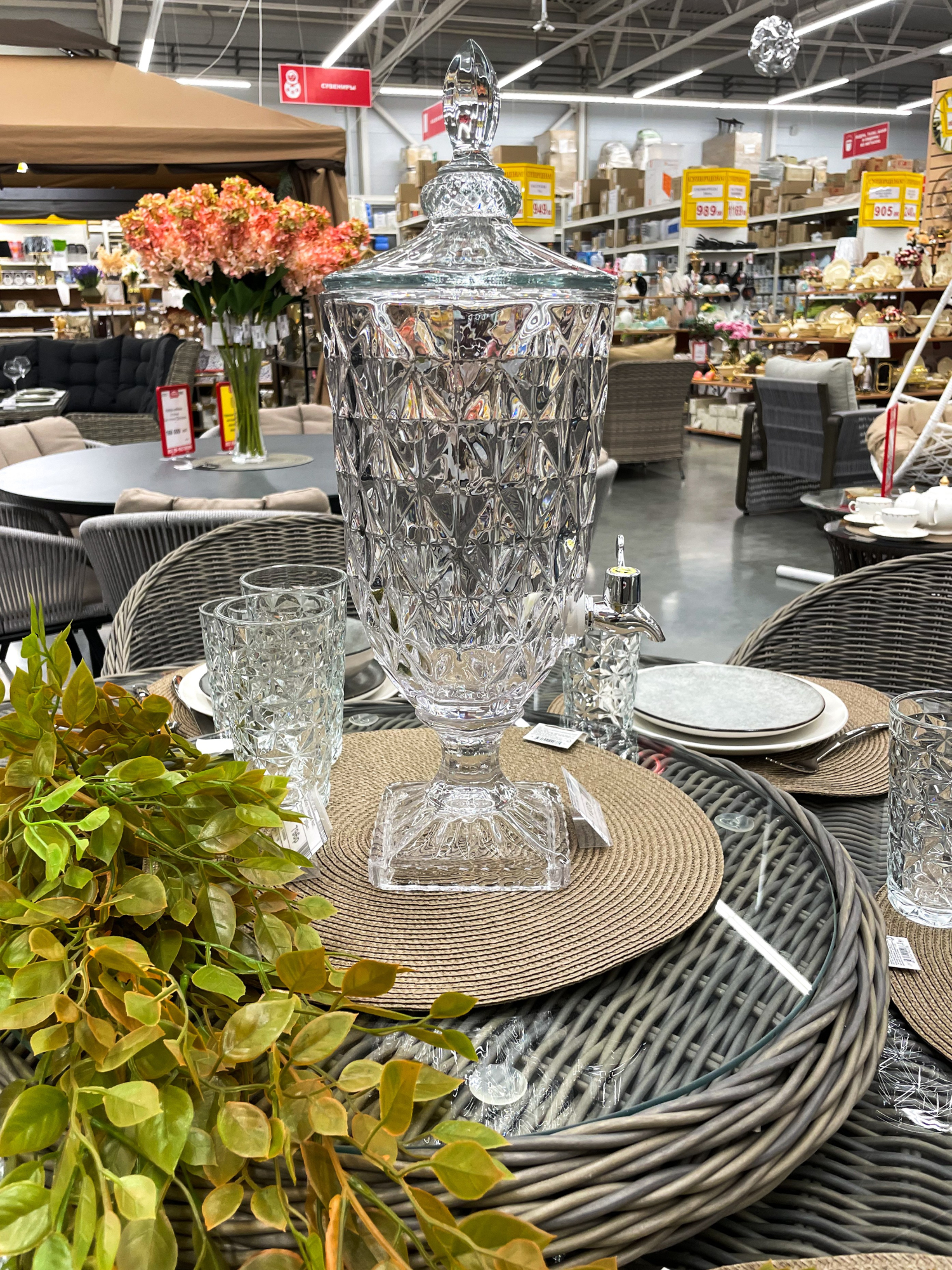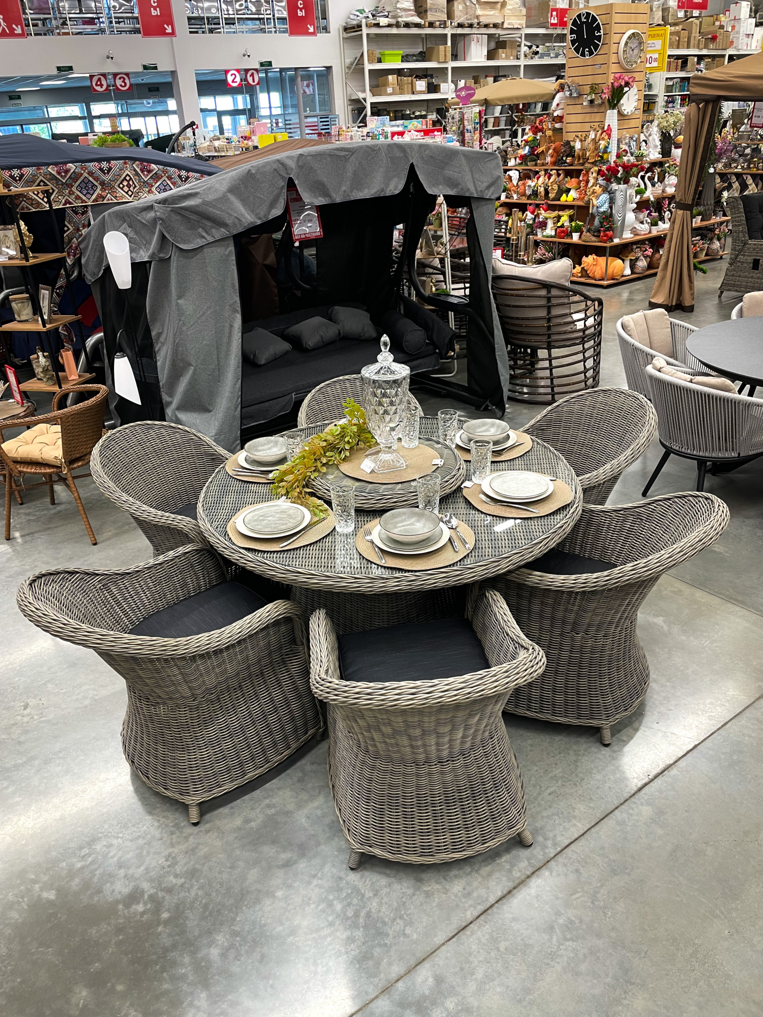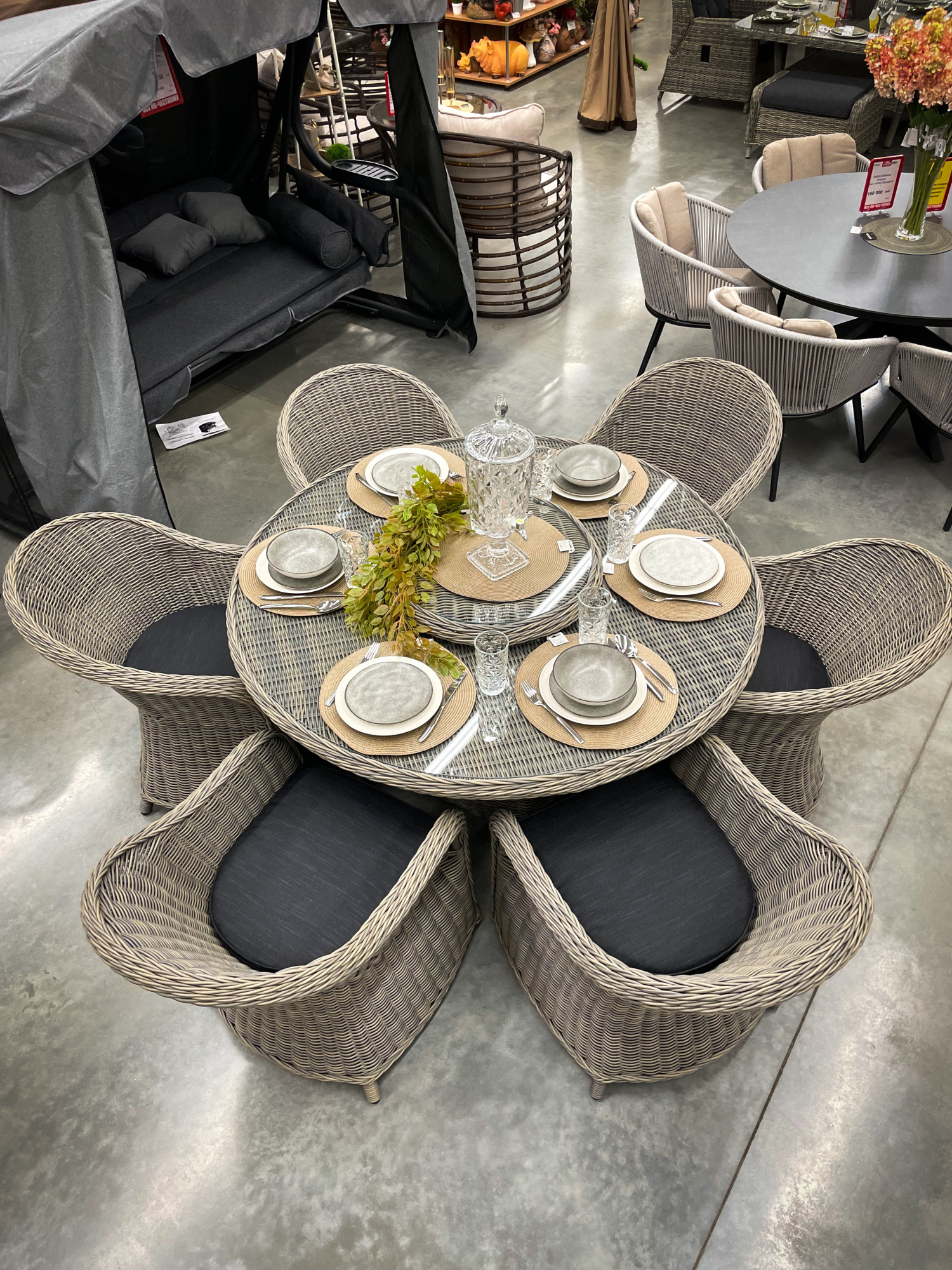 Особое внимание заслуживает стол, в центре которого расположена вращающаяся платформа. Любой гость сможет повернуть к себе ее нужным краем, при этом не вставая. Столешница и платформа защищены закаленным стеклом.