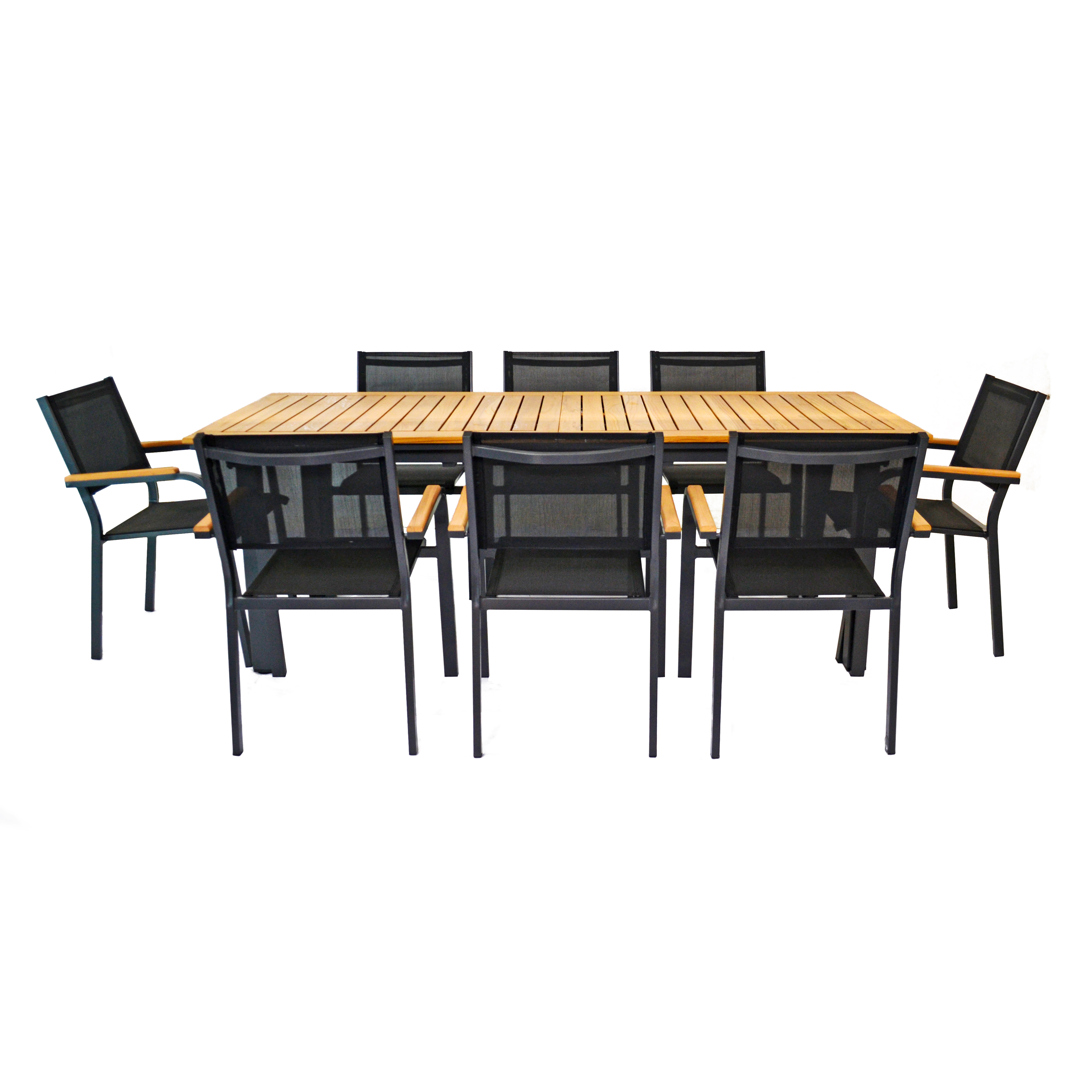 В комплект входят стол и восемь удобных стульев. Мебель отличается высоким качеством и долговечностью, что позволяет использовать её как на улице, так и в помещении.