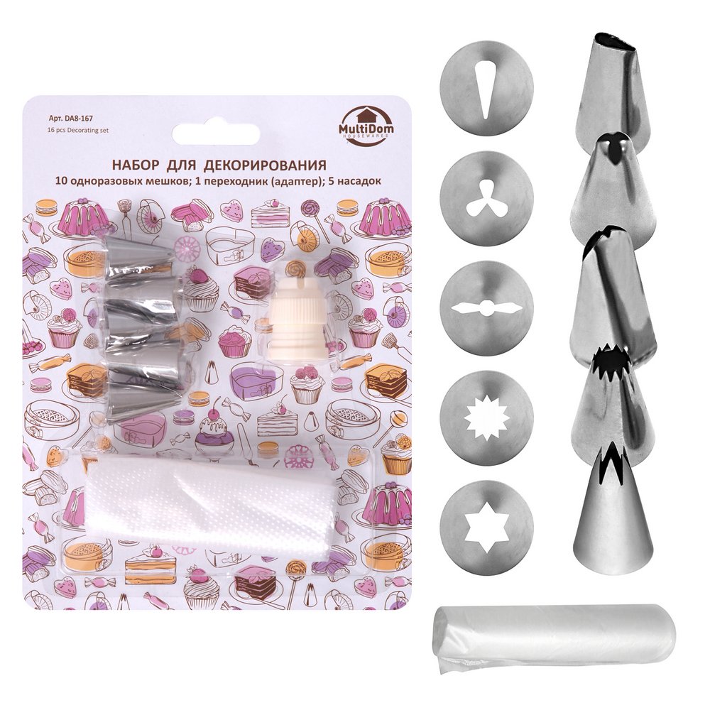 Набор предназначен для декорирования кондитерских изделий и выпечки. С помощью этого набора Вы сможете создавать из крема и глазури цветы, вензеля, узоры и фигурки не хуже профессиональных кондитеров. Украшайте с помощью набора для декорирования пирожные, печенье и торты разноцветными кремами или закуски густыми соусами. Фантазируйте и проявляйте свое творчество, привлекайте к украшению детей – совместное украшение может стать Вашей семейной традицией. Набор также станет отличным подарком Вашим родным и близким.