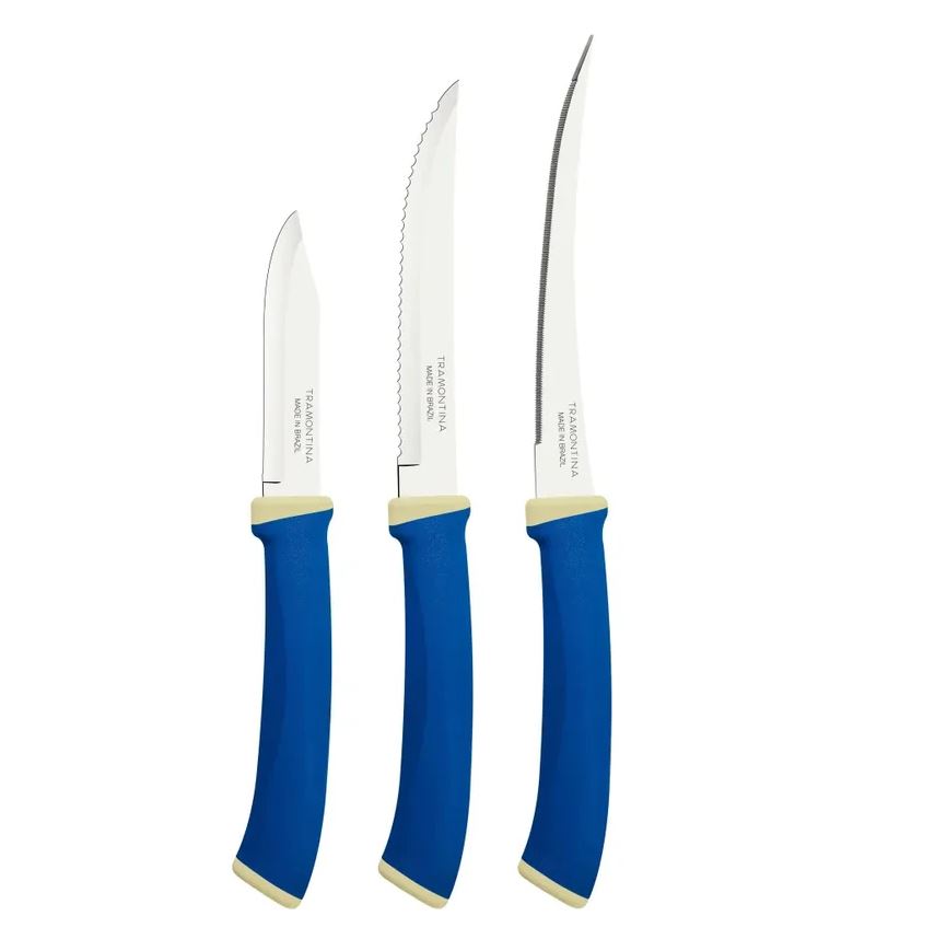 Удобный и практичный набор ножей Tramontina Felice для повседневного использования, который просто необходим на каждой кухне! В наборе маленький нож (7,5см) и два ножа с лезвием 12,5см с зубцами (для мяса) и микрозубчиками для томатов, цитрусовых и других мягких продуктов.Ножи с зубчатым лезвием очень удобны для нарезки хлеба, стейков, замороженных продуктов, сыра, помидоров. Позволяют легко нарезать продукты с твердой кожицей и нежной мякотью, не помяв мягкой сердцевины. Нож с волнистым лезвием не требует заточки, служит десятилетиями. Лезвия ножей из нержавеющей стали марки AISI 420, которая прошла термическую обработку и поэтому обладает повышенной прочностью - т.е. требует более редкой правки и заточки, что обеспечивает более долгий срок службы по сравнению с изделиями из аналогичной стали других производителей. И к тому же не боится коррозии, не абсорбирует запахи, предотвращает размножение бактерий. Полипропиленовые ручки не скользят и благодаря эргономичной форме удобно лежат в руке.