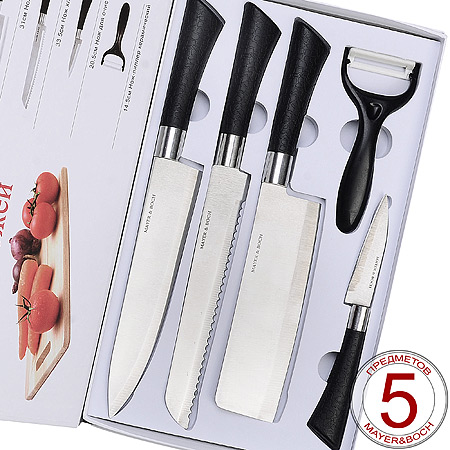 Высокая острота, надежное качество и стильный дизайн — это все, о нашем наборе кухонных ножей! Набор кухонных ножей MAYER&BOCH включает в себя 5 предметов: нож поварской, нож-топорик, нож хлебный, нож для очистки, нож пиллер. Наш набор ножей кухонных - это идеальный выбор истинных эстетов и профессионалов, прекрасное решение для тех, кто ценит надежные и качественные кухонные приспособления. Набор ножей с лезвиями из высококачественной нержавеющей станет незаменимым помощником на вашей кухне. Лезвия покрыты специальным антибактериальным Non-Stick покрытием, предотвращающим прилипание продуктов к лезвию ножа и обеспечивающим свежесть и гигиеничность продуктов при их нарезке. Поверхность клинков легко моется, не впитывает и не «передает» запахи пищи при параллельной нарезке различных продуктов. Благодаря острой заточке, ножи обладают высокими режущими свойствами. Нож поварской подходит от шинковки лука до разделки мяса. Хлебный нож гарантирует ровные ломтики не только свежей выпечки, но и позволяет нарезать продукты с жесткой кожурой, например, арбузы, дыни и ананасы. Нож-топорик применяется для рубки небольших кусков мяса, разделки замороженного мяса и рыбы, разрубания мелких костей и хрящей. Овощной нож идеален для нарезки картофеля или моркови, удобно чистить овощи и фрукты. Овощечистка прекрасно подходит для чистки различных овощей, фруктов, срезания цедры, и также для нарезания тонкими полосками. Кухонный набор ножей не только поможет вам с легкостью и быстротой разделывать продукты питания, но и подарит удовольствие от использования. Эргономичная ручка каждого изделия удобно ложится в ладонь, обеспечивая безопасную работу, комфортное положение в руке, надежный захват и не дает ножам скользить при использовании. Оригинальный дизайн изделий украсит вашу кухню, а благодаря красивой упаковке, такой набор ножей для кухни станет еще и прекрасным подарком! Порадуйте себя или удивите близкого человека этим отличным набором для кухни.