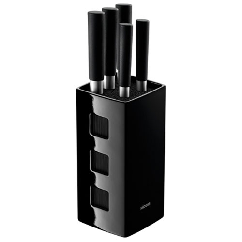 Традиционные японские ножи серии Keiko изготовлены из высококачественной нержавеющей стали, их лезвия остаются острыми долгое время. Ручки ножей выполнены из высокопрочного пластика и нержавеющей стали. Универсальный блок набора ножей изготовлен из керамики или натурального дерева (гевея), и является блоком нового поколения. Он позволяет хранить ножи в различном количестве и в произвольном порядке. Пластиковые волокна не тупят ножи и легко моются.