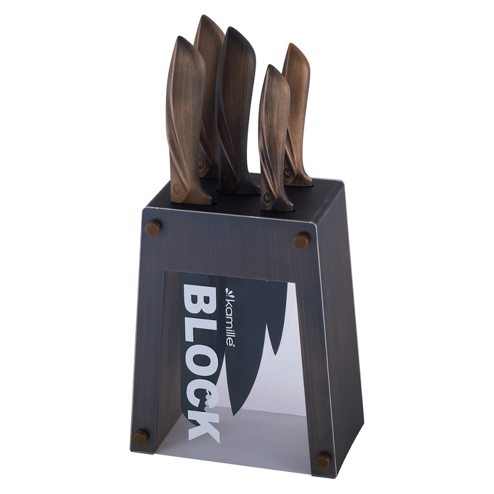 • Комплектация: нож шеф-повар (лезвие 19,2см/ручка 13), нож для хлеба (лезвие 19см/13ручка см), нож-слайсер (лезвие 19,5см/ручка 13см), нож универсальный (лезвие 12,2см/ручка 11см), нож для чистки овощей (лезвие 8,5см/ручка 11,5), подставка (17*21,2*11см).
