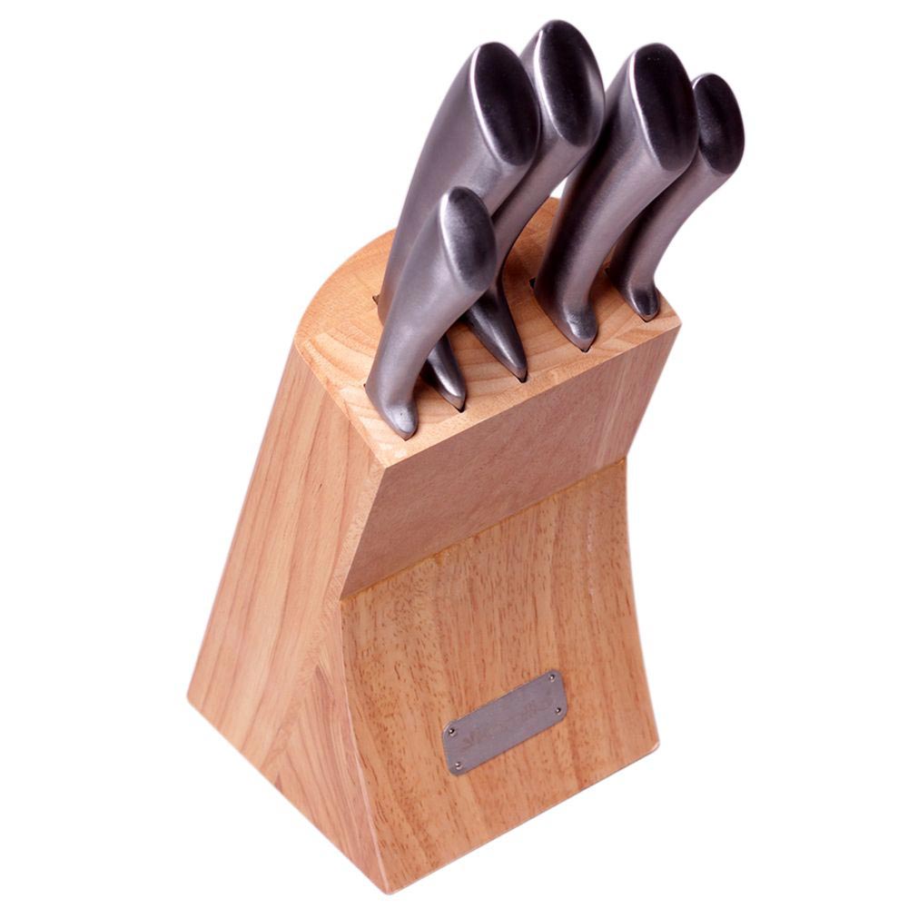 Ножи компактно размещаются на стильной деревянной подставке, которая также занимает минимально места на столе.