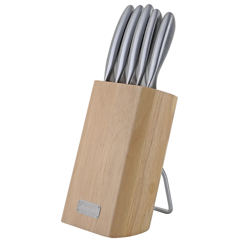 Комплект: нож для чистки овощей (лезвие 9 см, рукоятка 12 см), нож универсальный (лезвие 12 см, рукоятка 12,5 см), нож "Сантоку" (лезвие 16,5 см, рукоятка 13,5 см), нож для мяса (лезвие 19,5 см, рукоятка 13,5 см), нож "Шеф-повар" (лезвие 19,5 см, рукоятка 13,5 см), подставка.