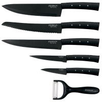 Набор ножей Zeidan состоит из 7 предметов. В набор входят: нож поварской (диаметр - 20 см),нож разделочный (диаметр - 20 см), нож для хлеба (диаметр - 20 см), нож универсальный (диаметр - 13 см), нож для овощей (диаметр - 9 см), овощечистка с керамическим лезвием и деревянный кейс. Лезвия ножей изготовлены из высококачественной нержавеющей стали и имеют безупречную заточку и оптимальную жесткость, лезвия с антибактериальным двусторонним покрытием. Ручки ножей прорезинены и инкрустированы декоративными камнями. Анатомическая форма ручек комфортно лежит в руке и обеспечивает удобство и безопасность работы.