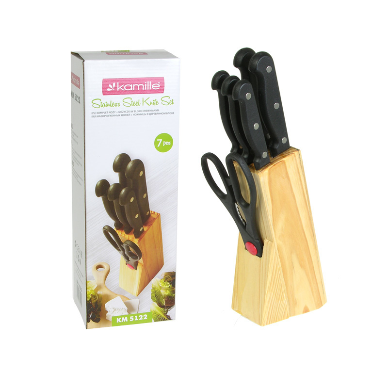 Комплектация: нож для чистки овощей (лезвие 9 см, рукоятка 10 см),нож для костей с зубчиками (лезвие 12.5см, рукоятка 10см), нож универсальный (лезвие 14.5см, рукоятка 10см), нож для мяса (лезвие 20см, рукоятка 11.5см), нож "Шеф-повар" (лезвие 20см, рукоятка 11.5см), ножницы с орехоколом 21 см, подставка.