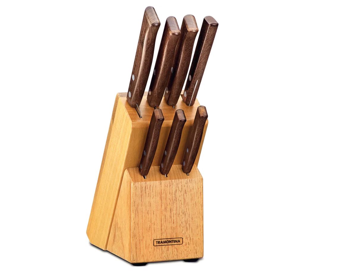 Набор ножей Tramontina Tradicional, 8 предметов оптимально подойдет как для любителей готовить, так и для профессиональных поваров. Рабочая поверхность произведена из высокопрочной отполированной стали, которая сохраняет блеск в процессе продолжительной эксплуатации. В комплектации предусмотрены модели различной длины, которые можно использовать для нарезки стейков, фруктов, овощей, мяса и других ингредиентов. Специальная подставка предназначена для удобного и безопасного хранения ножей. Резиновые ножки обеспечивают устойчивое положение на столах с поверхностью любого типа, в том числе стеклянной или пластиковой. Деревянная ручка обеспечивает надежный хват и предотвращает выскальзывание даже из влажных ладоней.